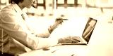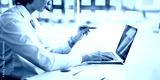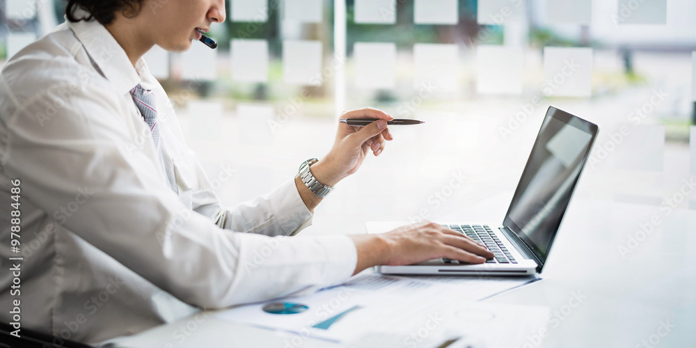Asian male taking via laptop video call conference remote at office workplace.