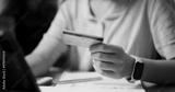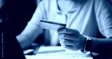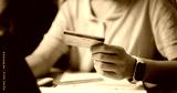 Selective focus, Relaxed female freelancer sitting at desk shopping online using a credit card and paying via digital tablet in home office. Work from home
