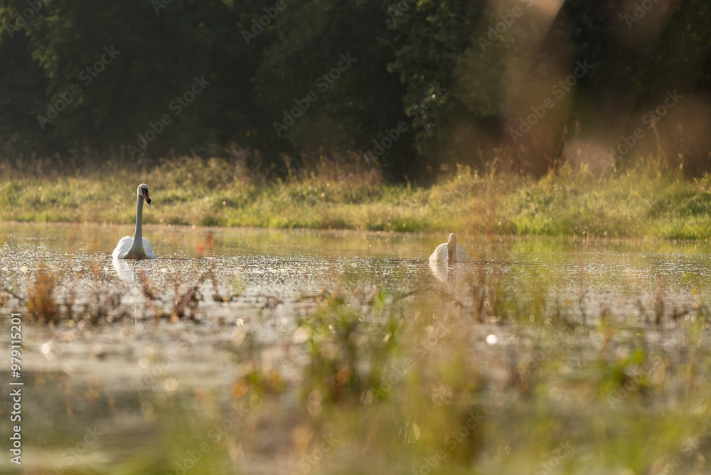 Para łabędzie o poranku w stawie, jesienią, tapeta.