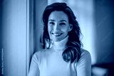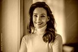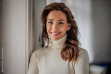 Close-up portrait of an attractive brunette haired woman smiling at the window