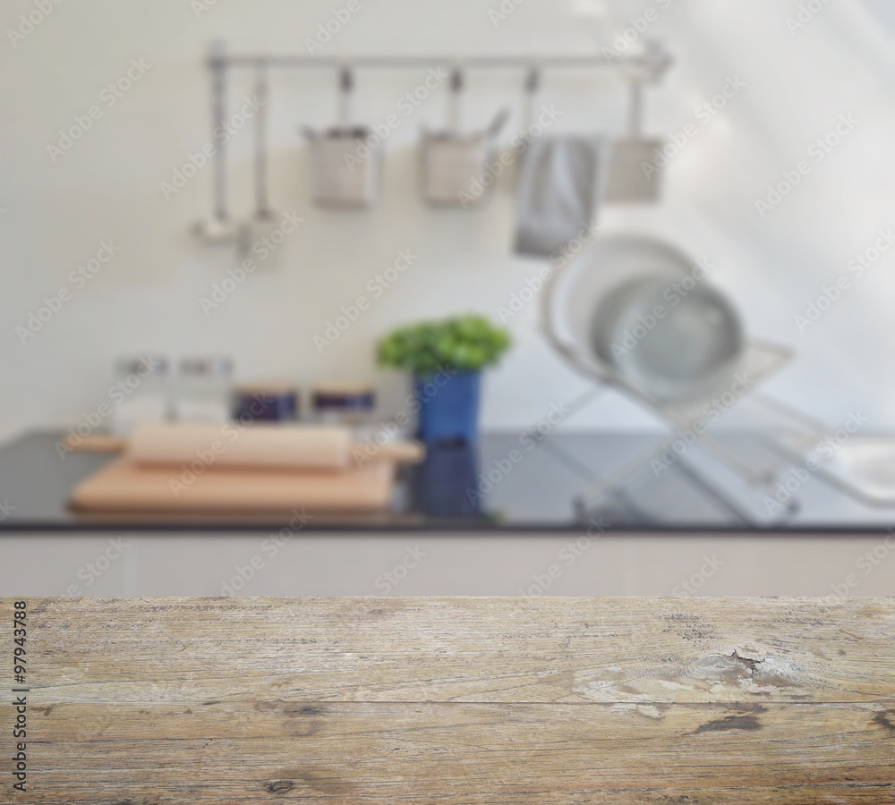 wooden table top with blur of modern ceramic kitchenware and ute