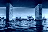interior on the roof of a luxury skyscraper hotel with a swimming pool