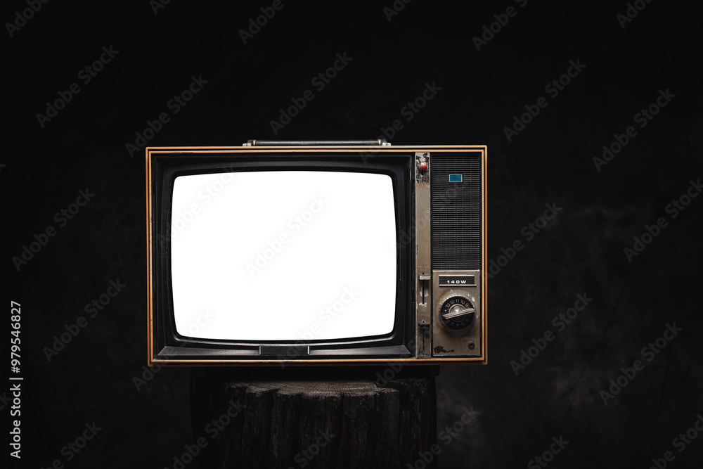 Retro old TV and cut out screen with clipping path on black background, closeup, front view