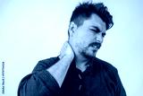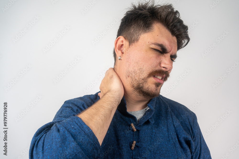 Young man suffering from neck pain. Headache pain. Young man suffering from neck pain on light background, side view