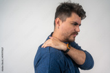 Handsome young man in blue shirt over isolated grey background suffering from pain in shoulder for having made an effort