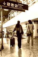 Two European businesswomen walk with their luggage towards the airport arrivals terminal