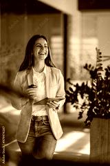 Business casual manager with tablet at office enjoying her coffee.
