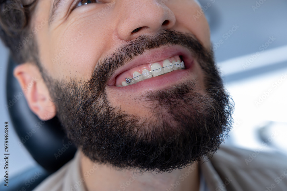 Bearded man patient visiting orthodontist for teeth whitening procedure and dental care