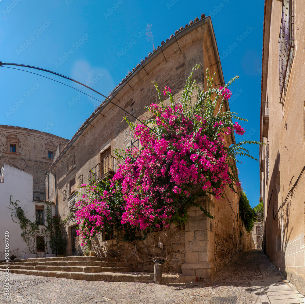 House decorated with a bougainvillea in a beautiful street in the old town of Caceres, Extremadura, Spain