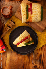 Traditional Kings day cake also called Rosca de Reyes, roscon, Epiphany Cake and and hot chocolate drink in a clay Jarrito. Mexican tradition on January 5th.