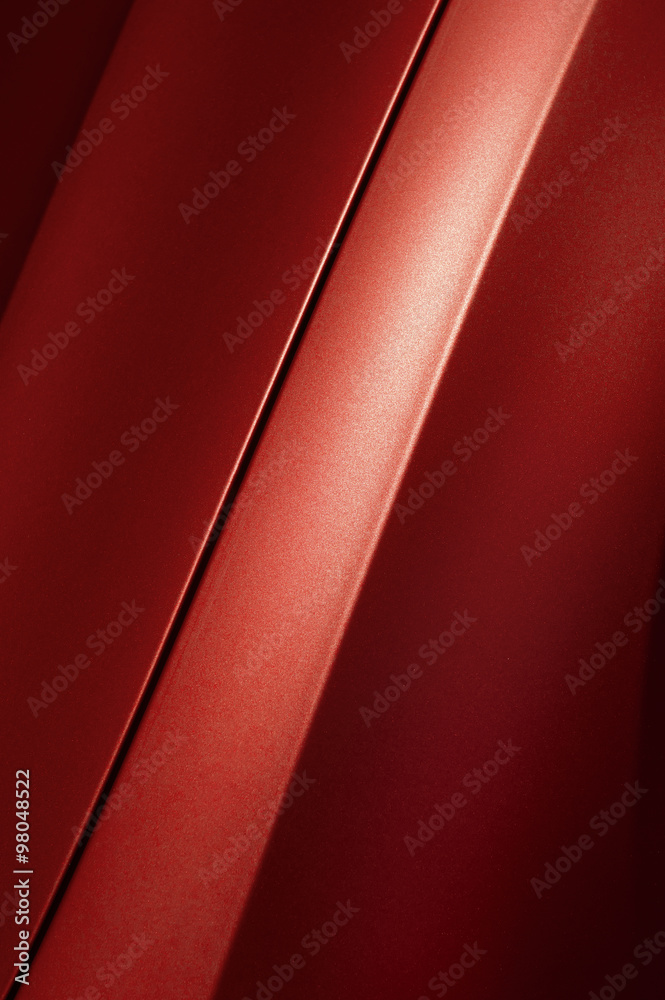 Surface of red sport sedan car, detail of metal hood and fender of vehicle bodywork
