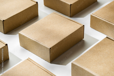 Brown cardboard boxes arranged on a light surface for packing goods in a warehouse setting