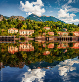 Old colorful buildings of Cadenabbia town reflected in the calm waters of Como lake. Wonderful summer scene of Italy, Europe. Traveling concept background.