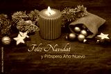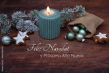 Decoración navideña rústica con vela, estrellas de canela, adornos navideños y el texto Feliz Navidad y Próspero Año Nuevo en español.