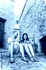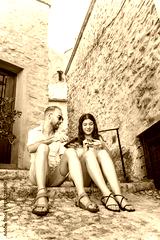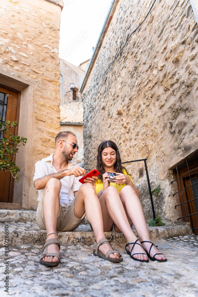 European couple of friends using a vintage camera on their vacation