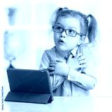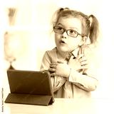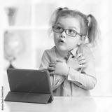 Scared kid with tablet PC in spectacles