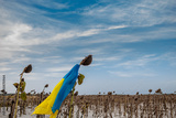 A withered sunflower in a Ukrainian field with a Ukrainian flag. The concept of the day of remembrance for fallen soldiers