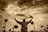 Ukrainian soldier holds Ukrainian flag in sunflower field. Remembrance Day concept for fallen soldiers