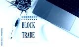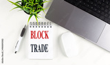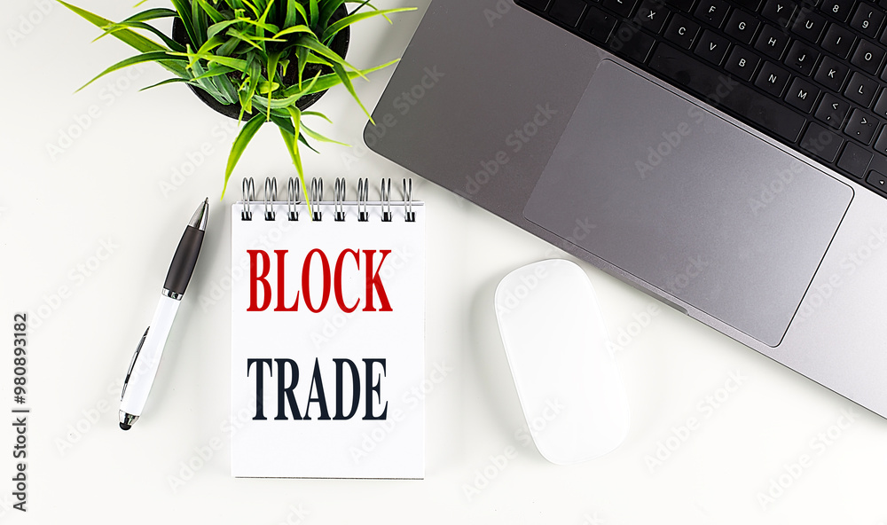 Notepad with block trade text on a desk with a pen, plant, laptop, and wireless mouse
