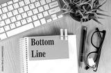 Bottom line text on a notepad with a keyboard, pen, glasses, and plant on a wooden desk