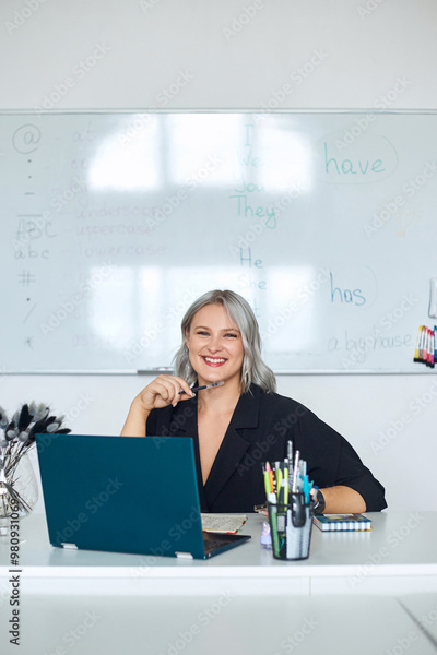 Photo of a pretty young woman working at a school. Online foreign language teacher