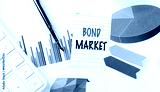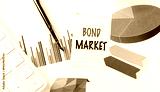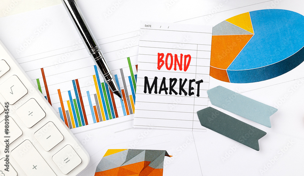 Index card with the text bond market placed on financial charts, next to a pen, calculator, and paper markers