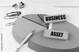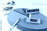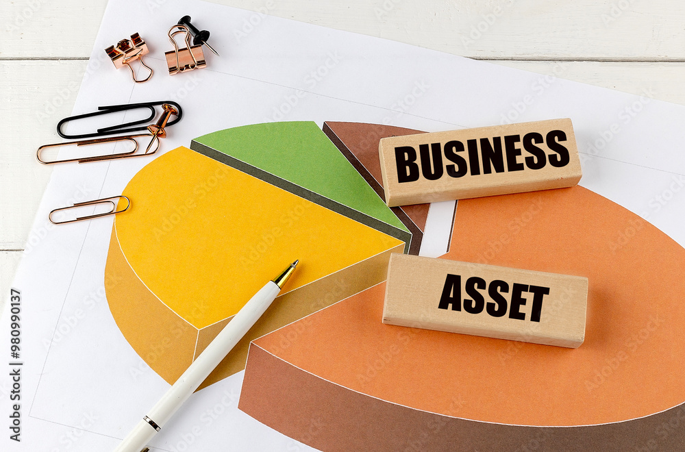 Wooden blocks with the text business asset on a pie chart, next to paper clips, push pins
