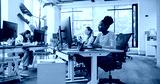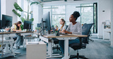 Zooming in on pretty woman with casual clothes working at computer in office. Distracted by camera from work and joyfully smiling. In background people sitting at their workplaces. Job concept.