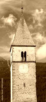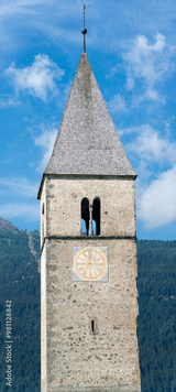 View of Lake Resia where you can admire the famous bell tower of
