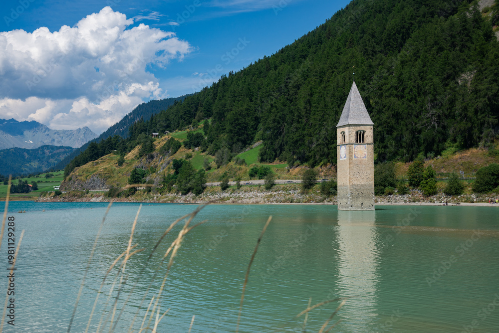View of Lake Resia where you can admire the famous bell tower of
