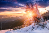 Colorful winter morning in the mountains. View of snow-covered conifer trees at sunrise.