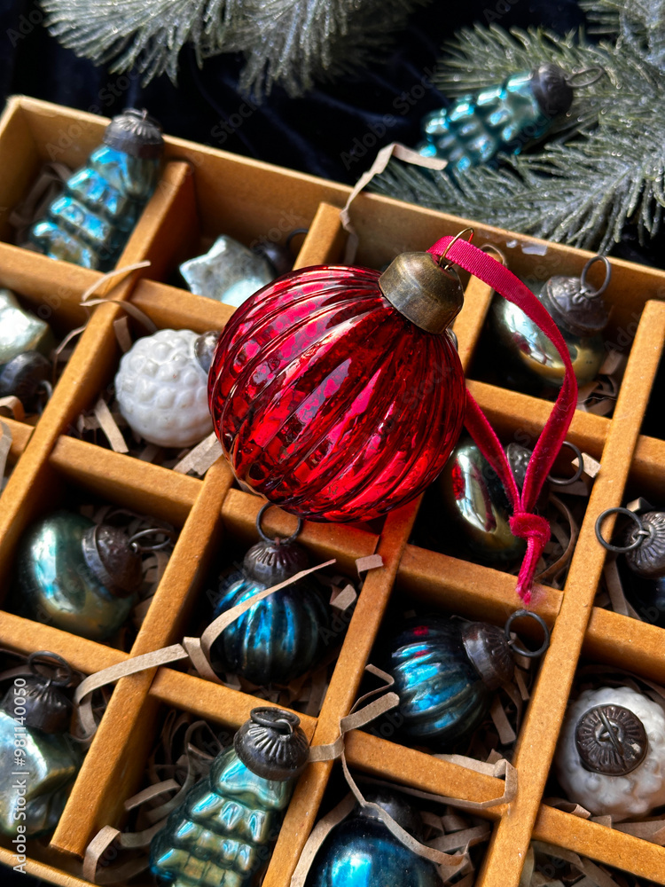 Box of vintage Christmas ornaments in green and blue on silver fabric backdrop, ready for holiday decoration.