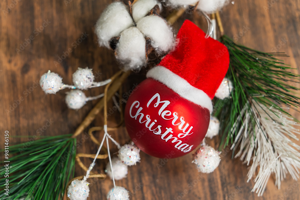 Red Christmas ball with words Merry Christmas with cotton on wooden background