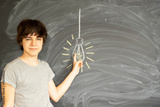 Tennage Boy thinking and getting an idea with empty black board in background