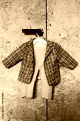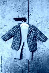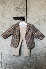 Baby boy outfit hanging on a door hook. Small suit for an elegant occasion. Children's fashion for special events. Formal wear for kids. Preparing for a celebration. Dressing up a young boy.