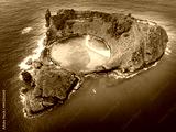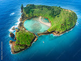 Aerial view of Ilheu de Vila Franca, a volcanic island near the Azores with a natural pool, ideal for swimming, snorkeling, and eco-tourism in a pristine coastal setting.