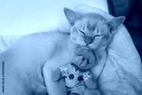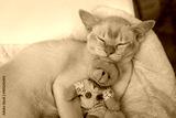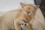 Adorable red Burmese kitten sleeps hugging a teddy bear