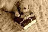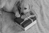 Little labrador puppy and gift box on a bed