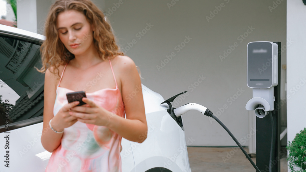 Modern eco-friendly woman recharging electric vehicle from home EV charging station. Innovative EV technology utilization for tracking energy usage to optimize battery charging at home. Synchronos