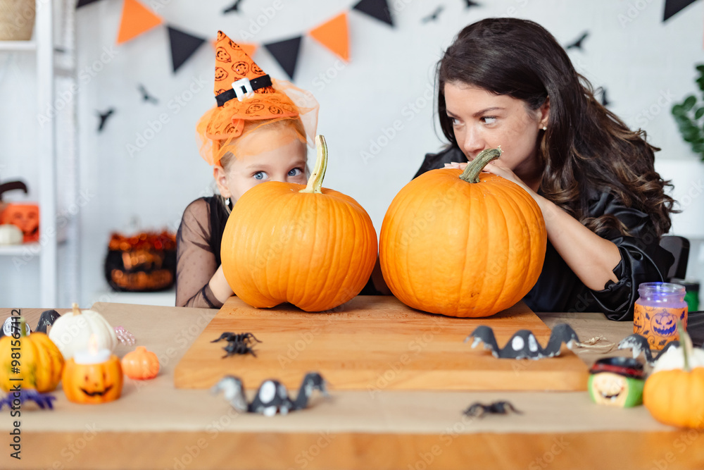 A playful mother and daughter peek over two pumpkins in a Halloween-decorated room. Both are dressed festively, with the daughter wearing a witch hat, surrounded by spooky decor and Halloween props.