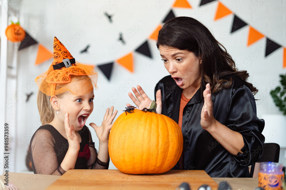 A mother and daughter, both dressed for Halloween, react with playful surprise as they look at a plastic spider on a large pumpkin. The scene is festive with Halloween decorations in the background.