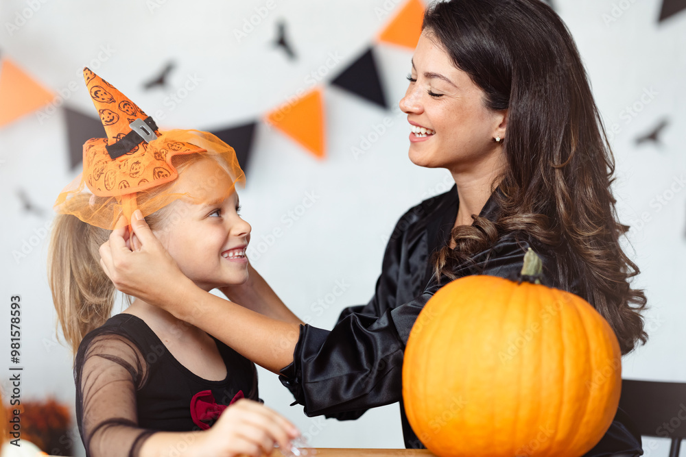A mother helps her daughter adjust a cute Halloween witch hat while they smile at each other. A carved pumpkin sits on the table, and festive Halloween decorations hang in the background.