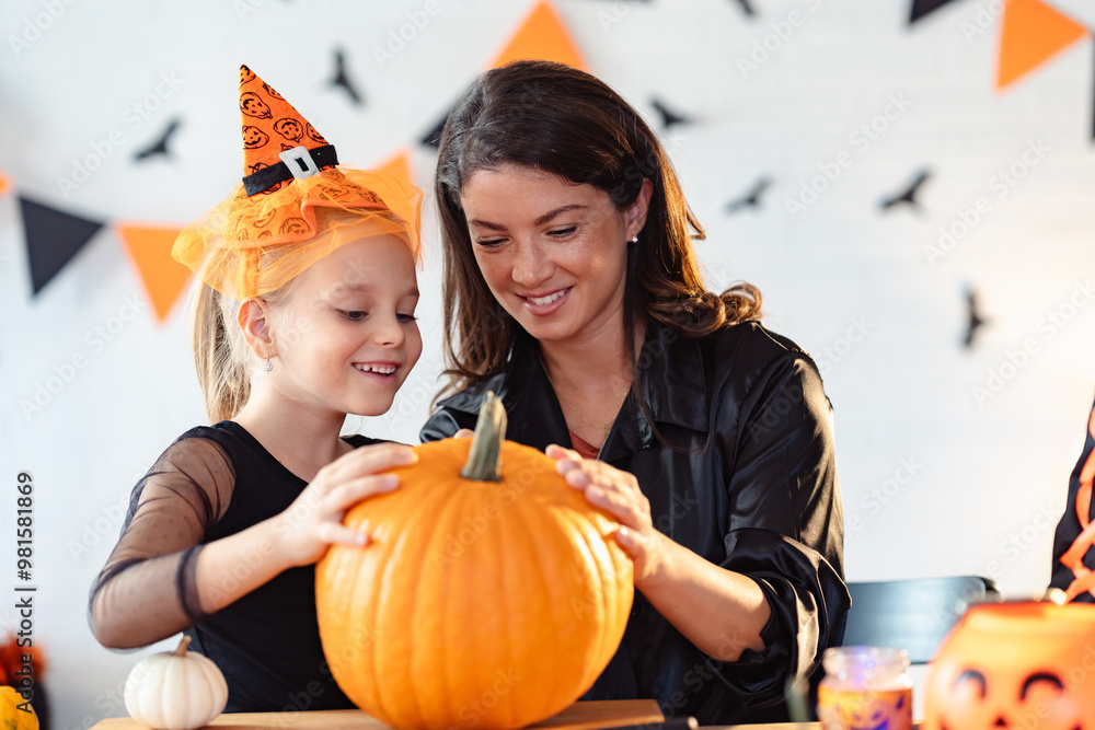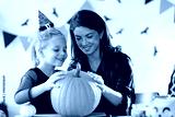 mother and daughter are focused on carving a pumpkin together. The little girl is wearing a Halloween witch hat, and both are engaged in the festive activity in a warm, indoor setting.