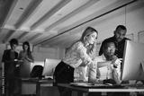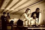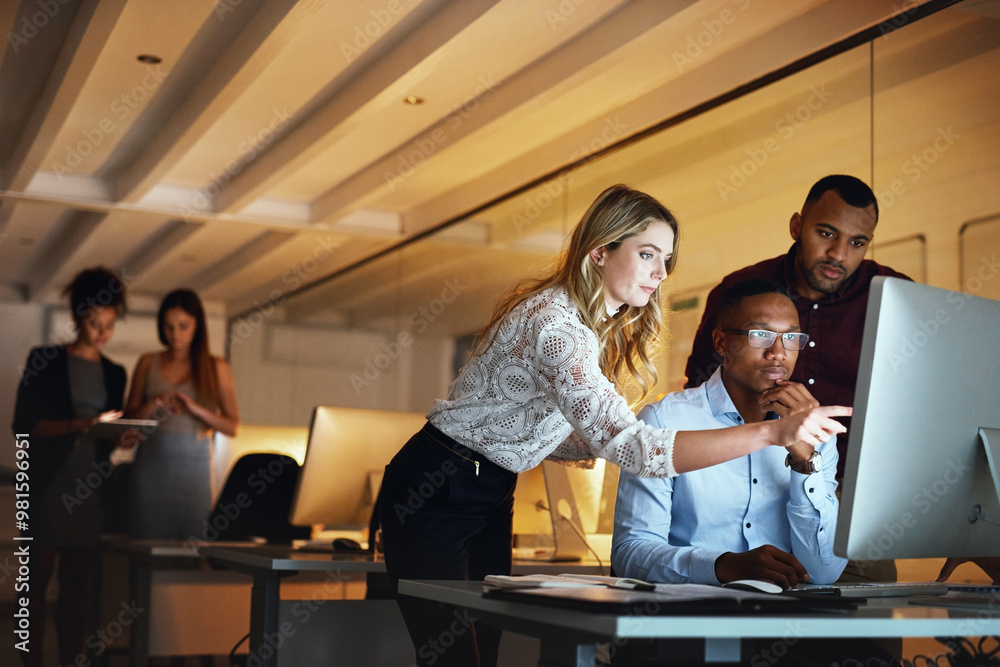 Business woman, men and night with computer, management and review in web design or teamwork. Colleagues, technology and working late on project deadline for digital agency, coworking space or office
