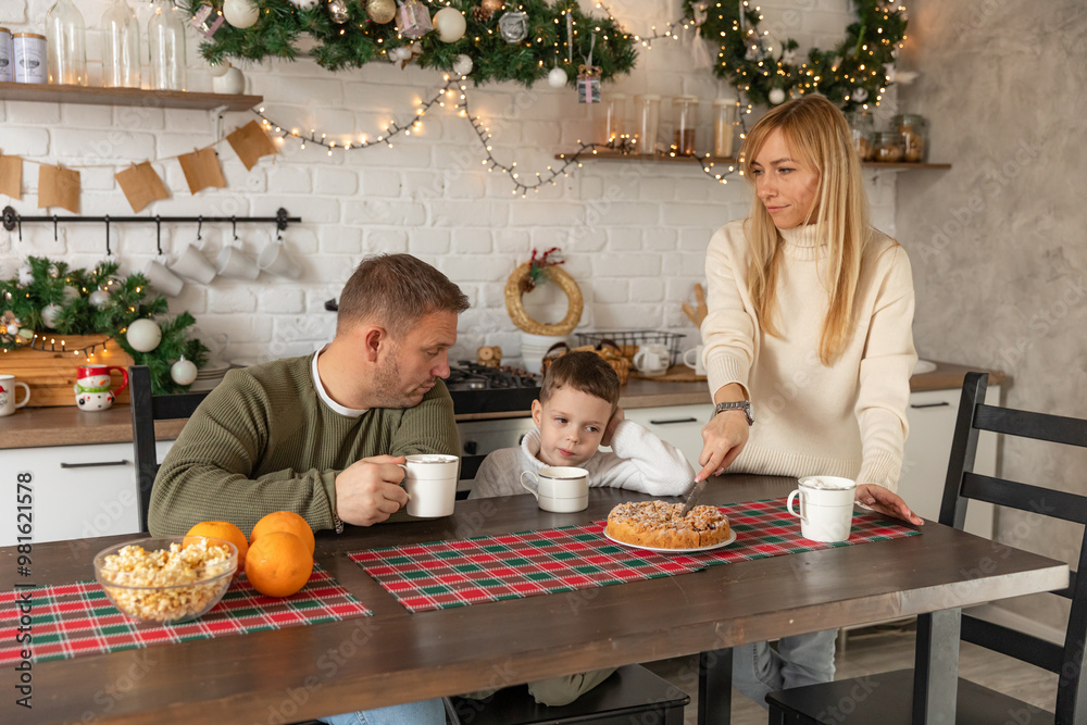Family mom, dad and little son drinking hot chocolate, tea, coffee, cocoa in kitchen at festive table and eating home made pie. Christmas tree and home decorated interior. Happy New Year.