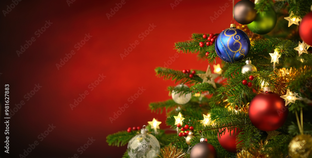 Festive elegant Christmas scene with the closeup of a nicely decorated fir tree and red illuminated background with vignetting and copy space