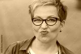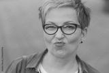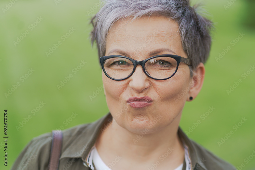 A woman with short hair and glasses is making a funny face. She is wearing a green shirt and a black purse
