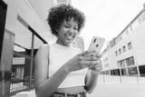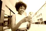 African american girl smiling using a cellphone to browse on internet with an app. Teenage girl sharing photos on the social media with a mobile phone. Young woman holding a smartphone outside