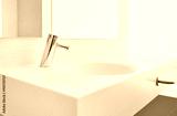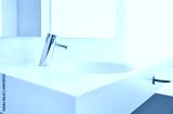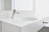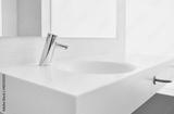 White ceramic sink and chrome faucet with temperature control and automatic activation in a spacious bathroom with a mirror and good natural lighting.