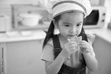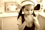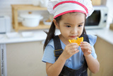 closeup cute asian little child girl eating slice orange in the kitchen